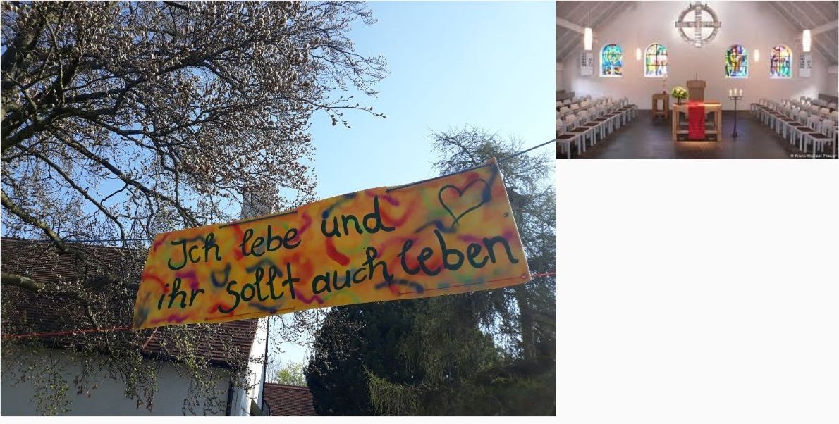 A banner in front of the St. Johanneskirche, Olching, Bavaria saying: ” I live and you to will live.”