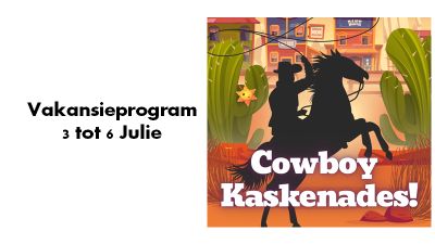 ’n Vakansieprogram word vanaf 3 tot 6 Julie vanaf 09:00 tot 12:00 in die saalkompleks vir laerskoolkinders aangebied. Die jongspan gaan op ’n avontuur in die Wilde Weste. Koste beloop R240 per kind vir al vier dae of R70 per dag indien kinders nie die hele program bywoon nie. Voltooi asb. die aanlyn inskrywingsvorm so gou moontlik.
